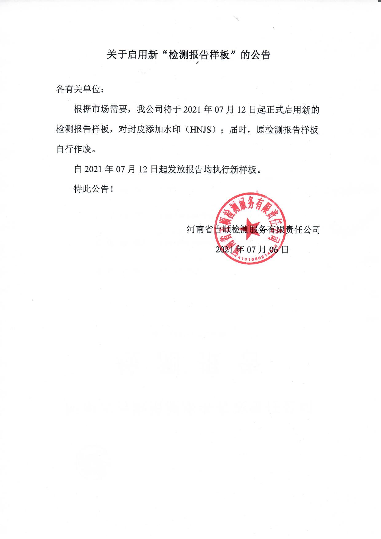 各有关单位: 根据市场需要,我公司将于2021年07月12日起正式启用新的检测报告样板,对封皮添加水印(HNJS);届时,原检测报告样板自行作废。 自2021年07月12日起发放报告均执行新样板。 特此公告!附:新检测报告样板