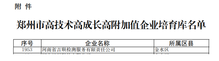喜报!近日,河南省吉顺检测服务有限责任公司成功入选郑州市“三高”企业培育库。2022年01月04日,郑州市工信局发布《关于公布郑州高技术高成长高附加值企业培育库名单的通知》。河南省吉顺检测服务有限责任公司,被纳入郑州市高技术高成长高附加值企业培育库。